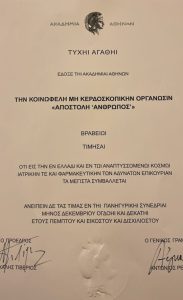 In 2025, the Academy of Athens, the highest intellectual institution of Greece, honored Mission ANTHROPOS, with an Award without prior announcement, in the category of First-Class Awards of the Positive Sciences, for its provision of medical and pharmaceutical support to vulnerable groups and to individuals without access to healthcare services in Greece and the developing world.